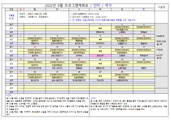9월 프로그램계획표 페이지 정보 작성자 인덕요양원 작성일22-08-29 14:07 조회7,534회 댓글0건 관련링크 이전글 다음글 목록 본문 우리 어르신과 함께할 프로그램 계획표 입니다. 이전글 다음글 목록
