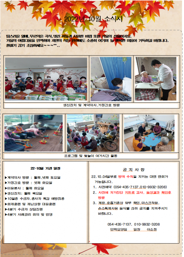 22-10월 소식지 페이지 정보 작성자 인덕요양원 작성일22-10-05 09:24 조회7,651회 댓글0건 관련링크 이전글 다음글 목록 본문 22년 10월 소식지 입니다. 어르신들과 함께하는 행복한 계절 가을입니다. 이전글 다음글 목록